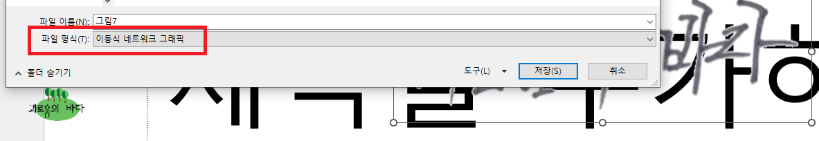 8. 그림으로 저장후 그림파일을 다시 불러왔을 때 투명하지 않다면 저장시 파일형식을 이동식네트워크그래픽으로 저장하여 보시기 바랍니다.